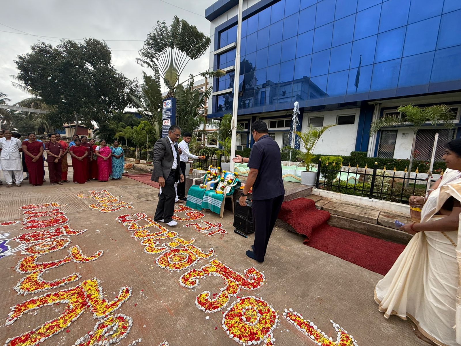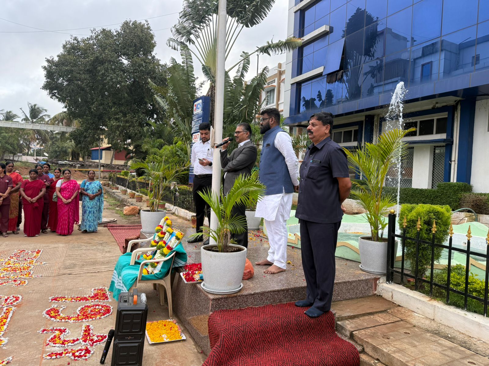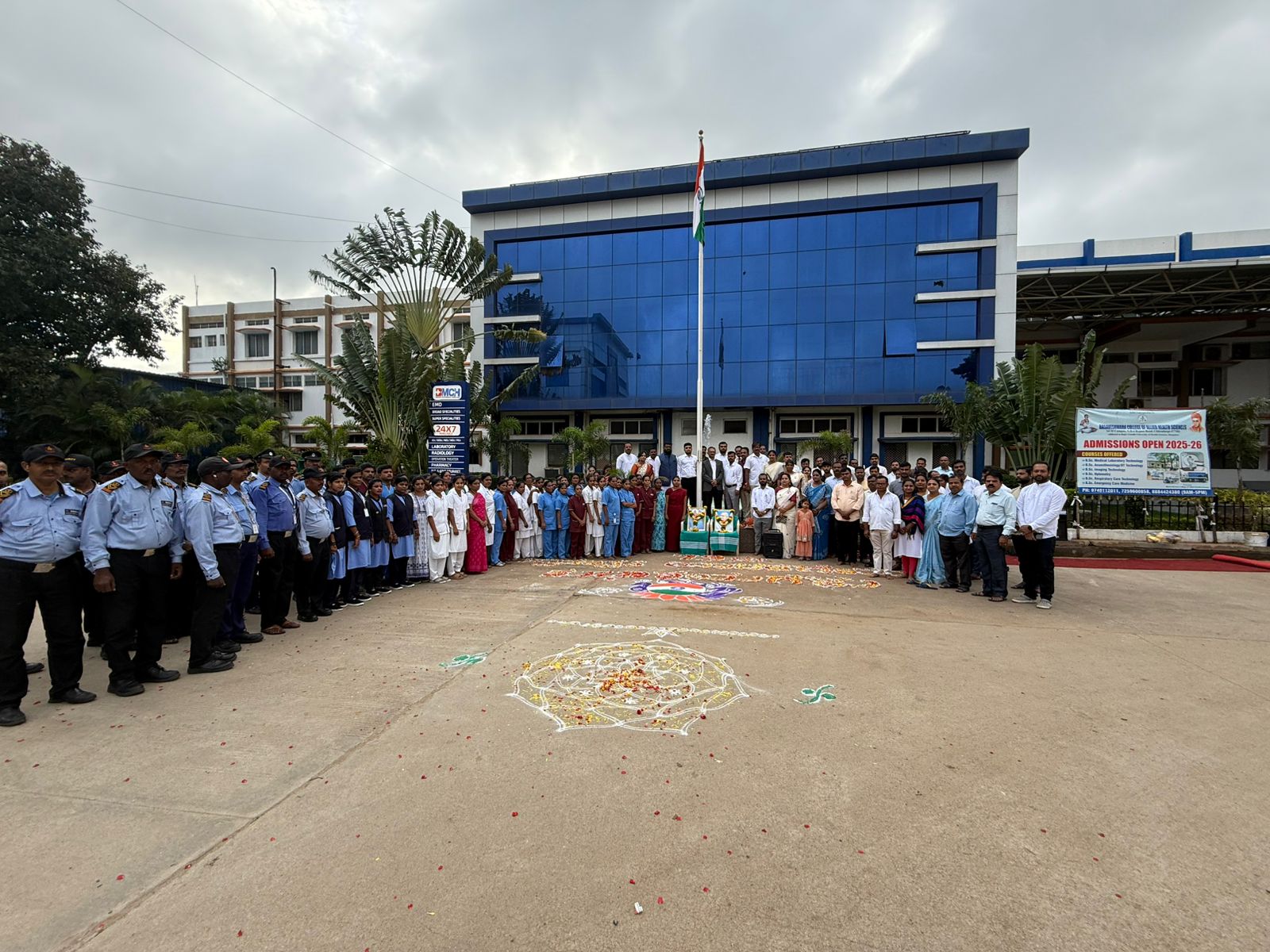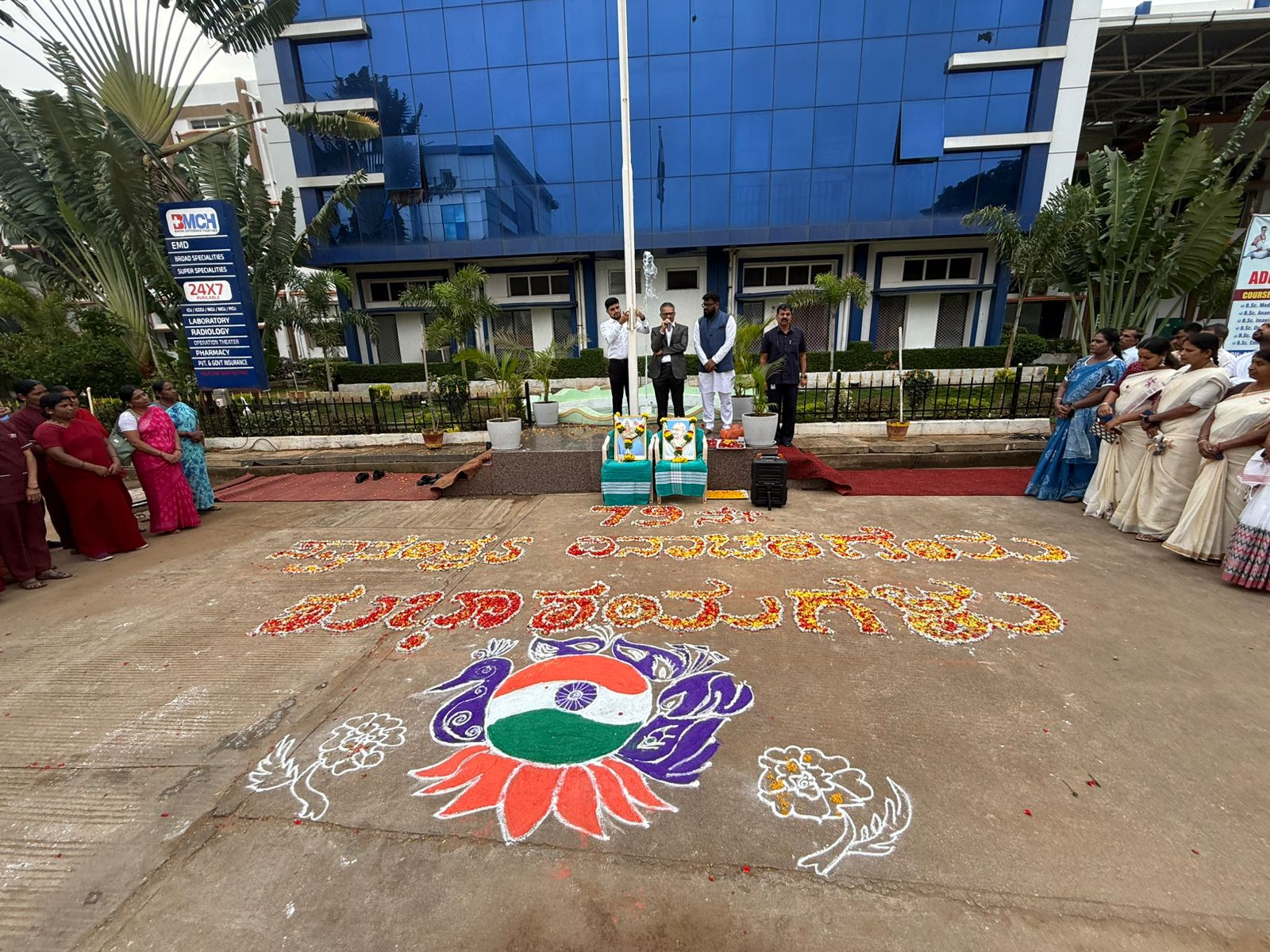 The 79th Independence Day was celebrated by hoisting the flag at Basaveshwara Medical College and Hospital. Medical Superintendent Dr. Rajesh hoisted the flag and paid floral tributes to Bharatambe and Mahatma Gandhiji.